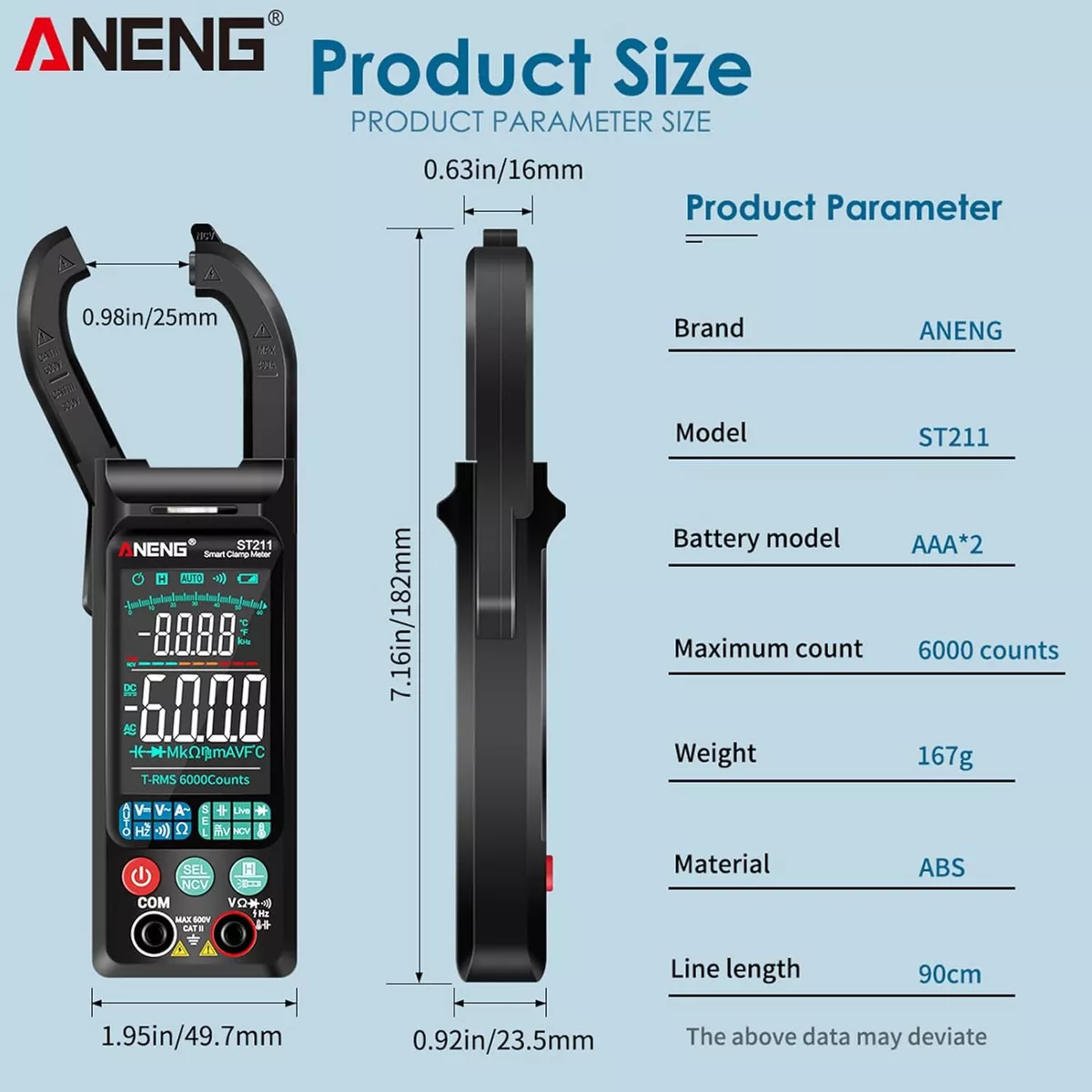 The ANENG ST211 Digital Clamp Meter is an accurate and reliable tool designed to measure alternating current (AC) and direct current (DC) efficiently. Ideal for technicians and electrical enthusiasts, this meter has various functions such as voltage, resistance, frequency, and diode testing. Its backlit display and ergonomic design make it easy to use in any work environment, even in low-light locations.