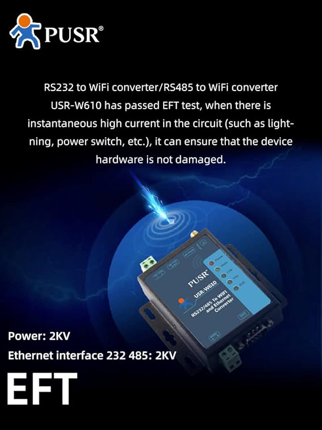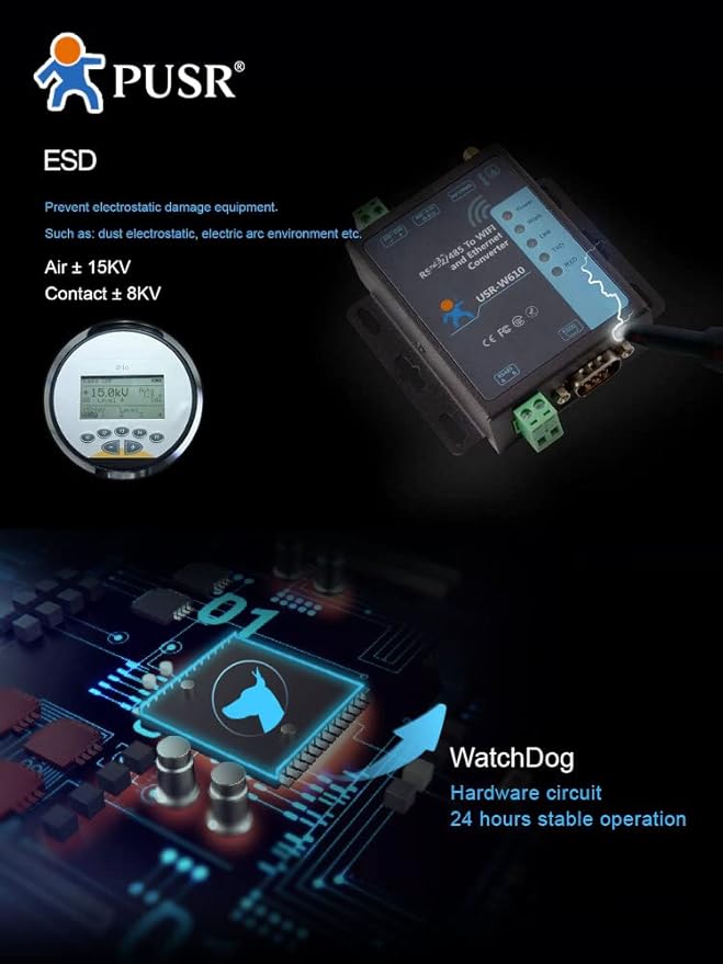 The USR-W610 is a high-efficiency WiFi/Ethernet serial-to-Ethernet converter that enables bidirectional and transparent data transmission between RS232, RS485 interfaces and Ethernet/Wi-Fi networks. Designed for industrial applications, this device supports Modbus RTU/TCP, MQTT, http, among others, and offers a secure connection through SSL/TLS encryption.