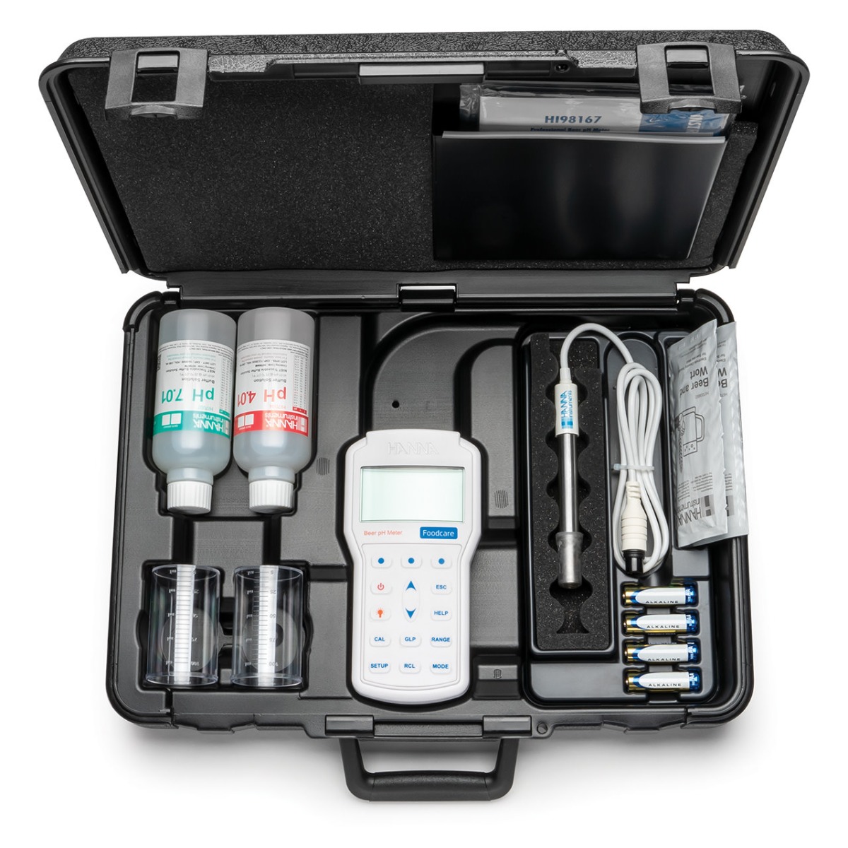 The HI98165 is a rugged, waterproof, and portable food pH meter that measures pH and temperature using the specialized pH electrode for cheese, FC2423. This professional and waterproof equipment meets IP67 standards. The HI98165 is supplied with all the necessary accessories to perform a pH/temperature measurement, distributed in a durable thermoformed carrying case, which keeps the meter, probe and calibration standards safe.
