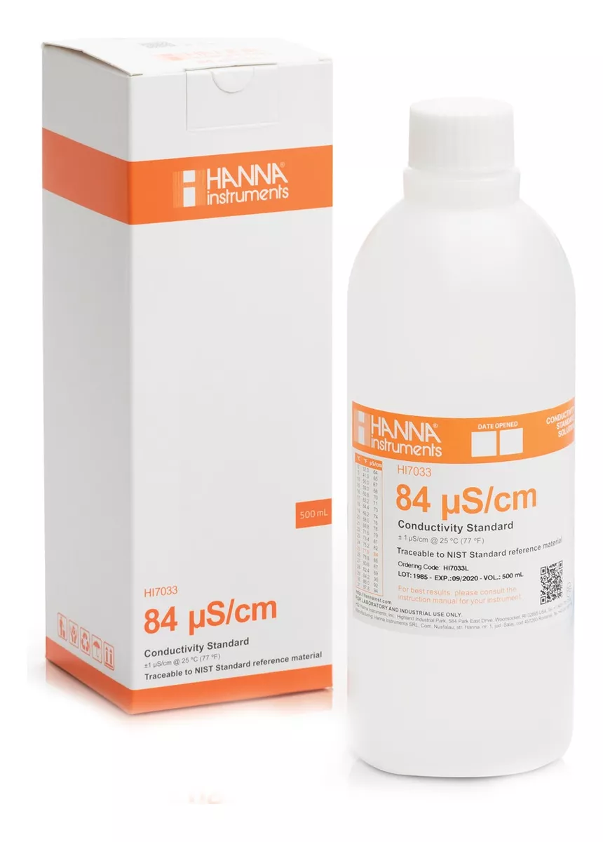 HI7033L is a premium conductivity solution that is prepared with a NIST traceable potassium chloride solution. Hanna’s conductivity solutions have the lot number and expiration date clearly marked on the label and are airtight with a tamper-proof seal to ensure the quality of the solution.