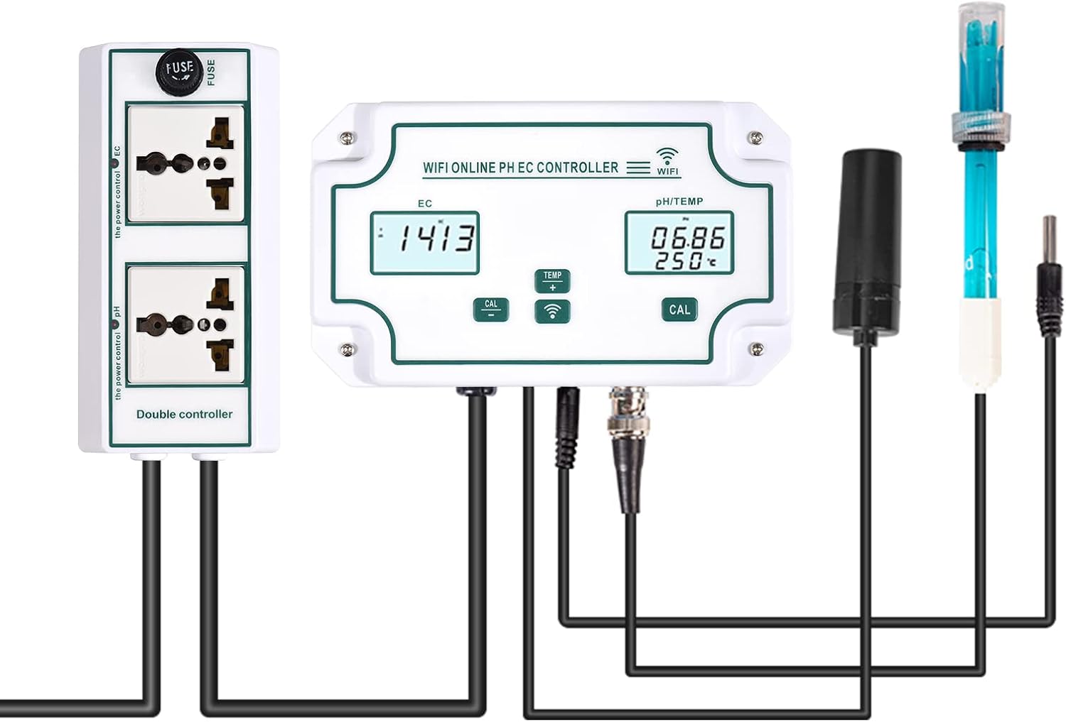 Daoco 3 in 1 pH/EC/TEMP Water Quality Detector Wireless Online EC pH Controller WiFi Professional pH Controller with Relay Plug Interchangeable Electrode BNC Type Probe Water Quality Tester for
