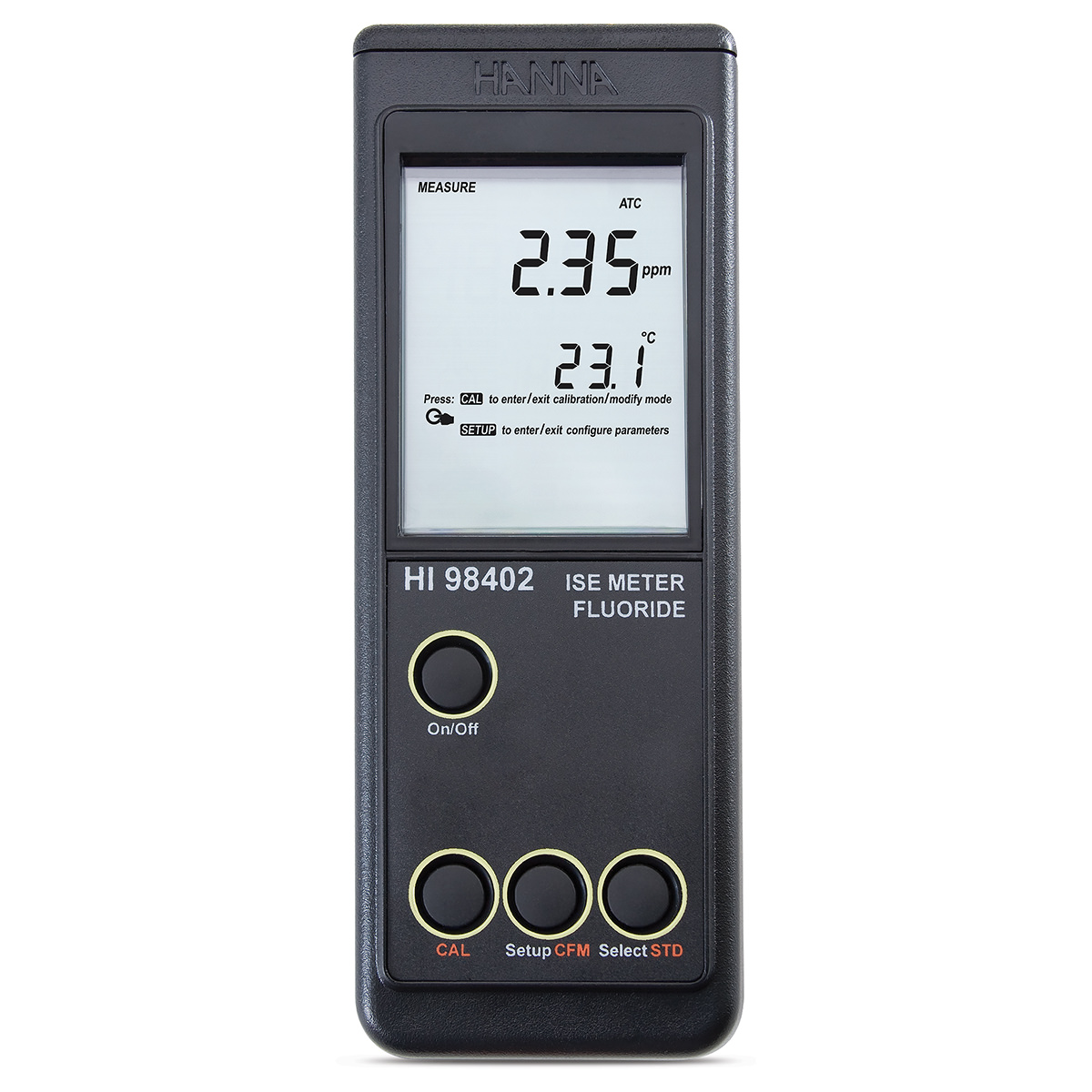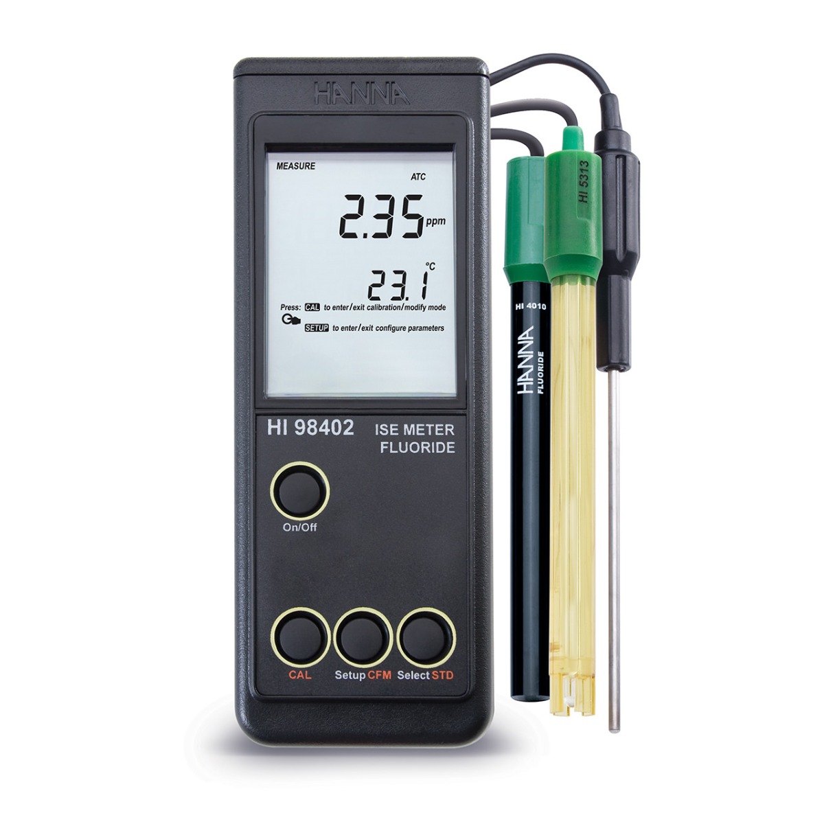 The HI98402 is a portable, waterproof and rugged fluoride meter. This meter offers many features including automatic calibration, on-screen instructions, and automatic temperature compensation. The HI98402 requires a half-cell fluoride electrode with HI4010 epoxy body and a HI5313 reference electrode constructed of PEI material. They are available as accessories.