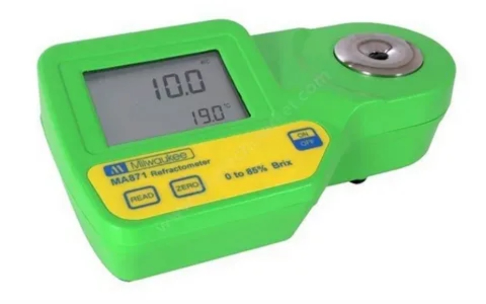 The MA871 is an optical instrument that uses the refractive index to determine the Brix% level of sugar in aqueous solutions. The method is simple and fast. Samples are measured after zero calibration with deionized or distilled water. In a matter of seconds, the instrument measures the refractive index of the sample and converts it to % of Brix concentration units.