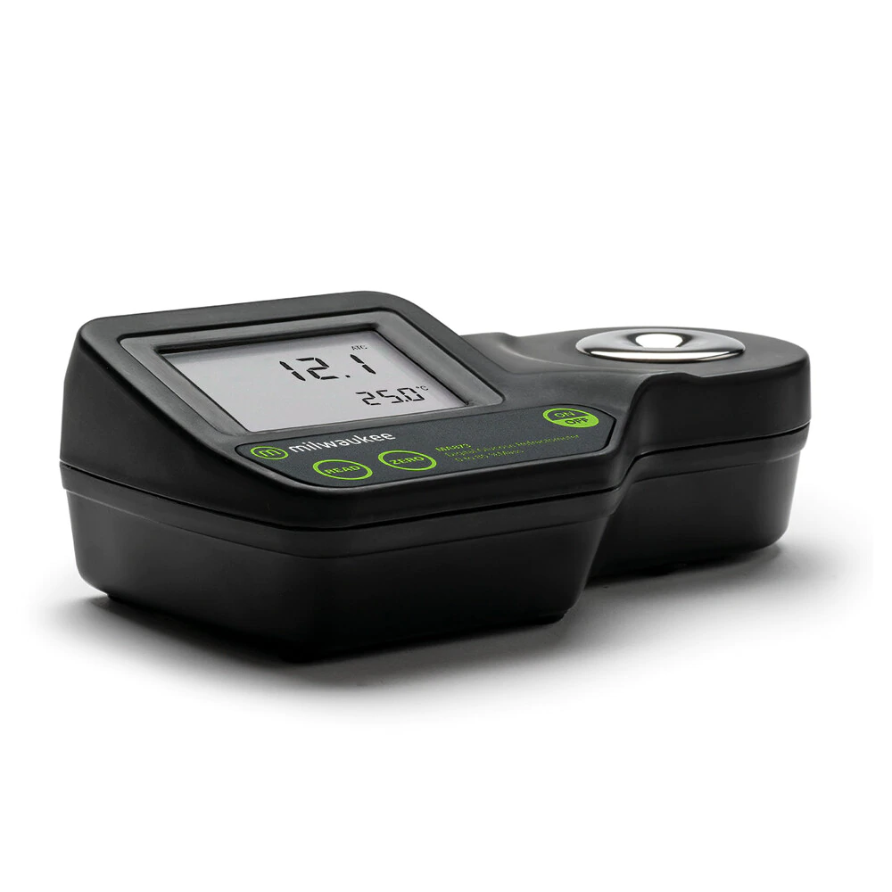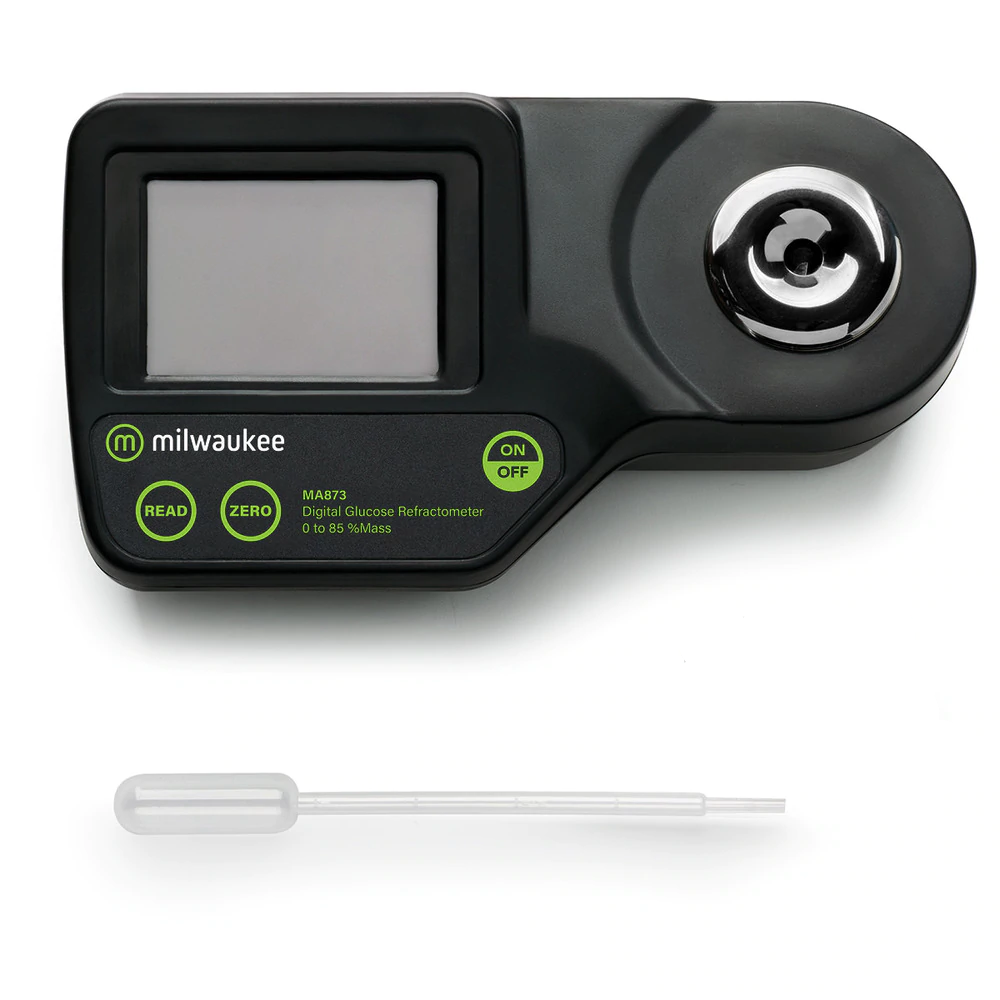 The Milwaukee Digital Glucose Refractometer is temperature compensated with a mass glucose range of 0 to 85% and an accuracy of +/- 0.2 percent. It is easy to use with simple two-button operation and fast with a response time of less than 2 seconds. Maintenance is also very simple with an easy-to-clean sealed flint glass prism and a stainless steel well.