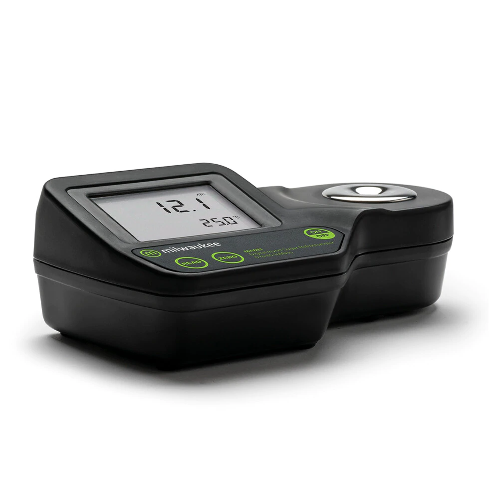 The Milwaukee Digital Inverted Sugar Refractometer is temperature compensated with a MASS range of 0 to 85% and an accuracy of +/- 0.2 percent. It is easy to use with simple two-button operation and fast with a response time of less than 2 seconds. In seconds, the instrument measures the refractive index of the sample and converts it into concentration units of % by weight. Maintenance is also very simple with an easy-to-clean sealed flint glass prism and a stainless steel well.