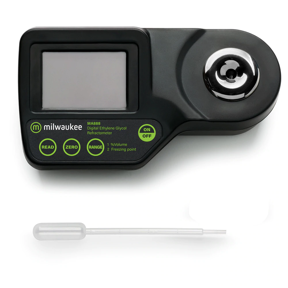 The Milwaukee Digital Ethylene Glycol Refractometer has temperature compensation with a range of 0 to 100% volume / 0 to -50°C (32 to -58°F) freezing point / Temperature from 0 to 80°C (32 to 176°F) and +/- 0.2 volume / +/- 0.5°C (+/- 1°F) freezing point accuracy. It is easy to use with simple two-button operation and fast with a response time of less than 2 seconds. Maintenance is also very simple with an easy-to-clean sealed flint glass prism and a stainless steel well. The MA888 takes the uncertainty out of optical refractometers by providing an accurate digital readout.