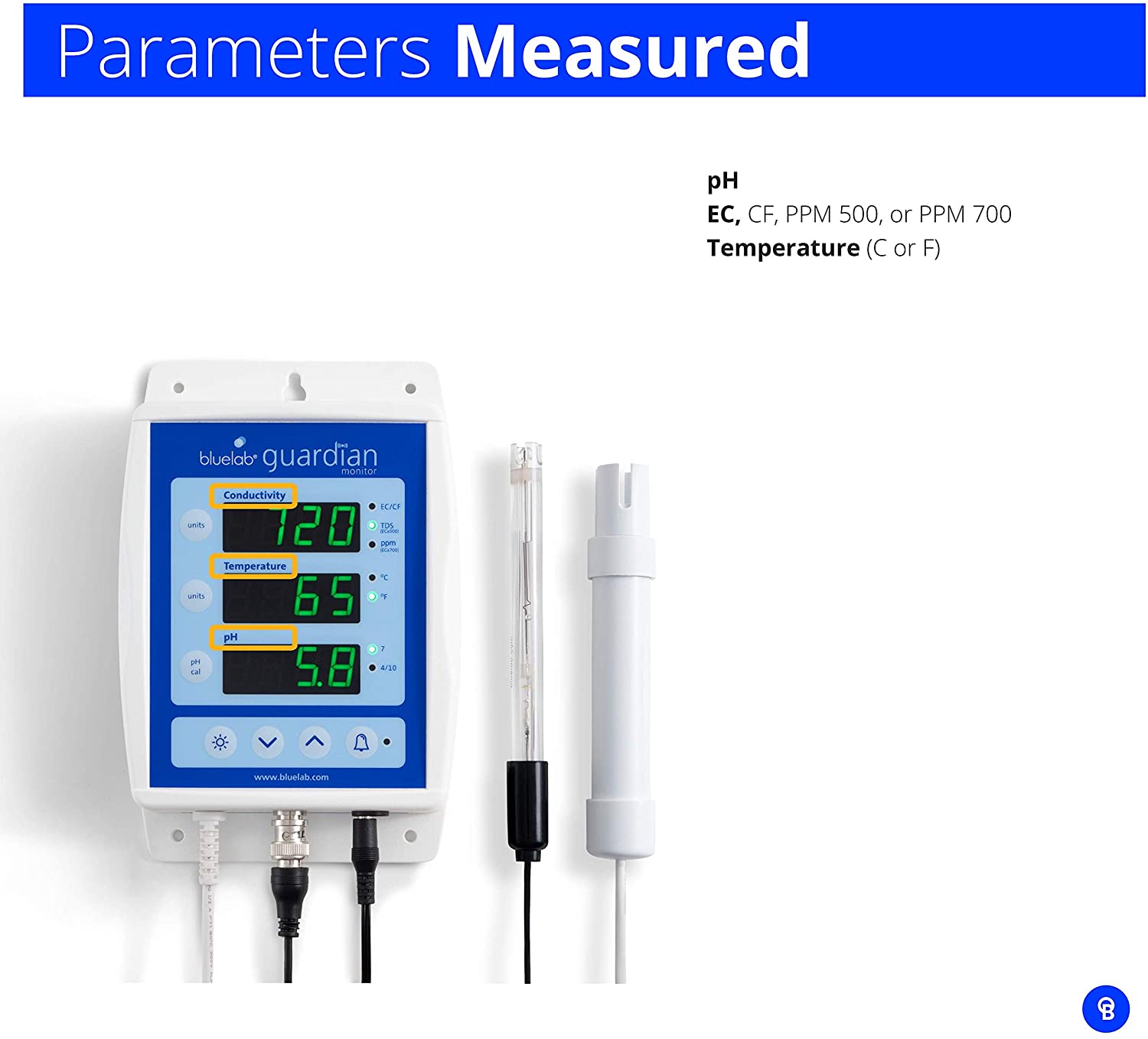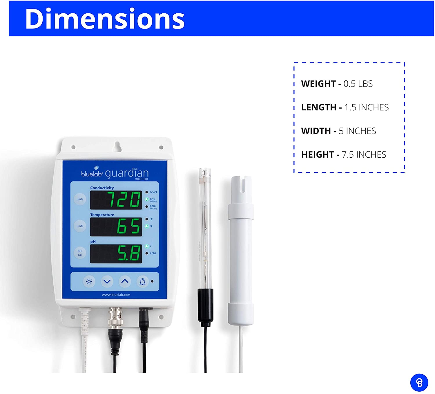 Combine with the Bluelab pen and meter for complete control of garden nutrients in water and soil; Other Features: International Power Supply, Waterproof Design; KIT INCLUDES: Calibration solution, EC probe and pH probe, probe care kit sold separately