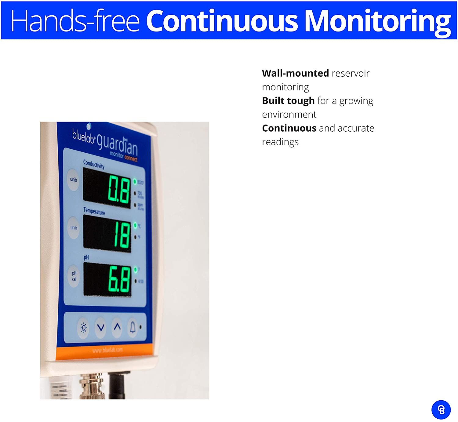 Bluelab MONGUA Guardian Monitor for pH, temperature and conductivity (TDS) measurements in water with easy calibration, 3 in 1 digital nutrient meter for hydroponic system and indoor plant cultivation, white color