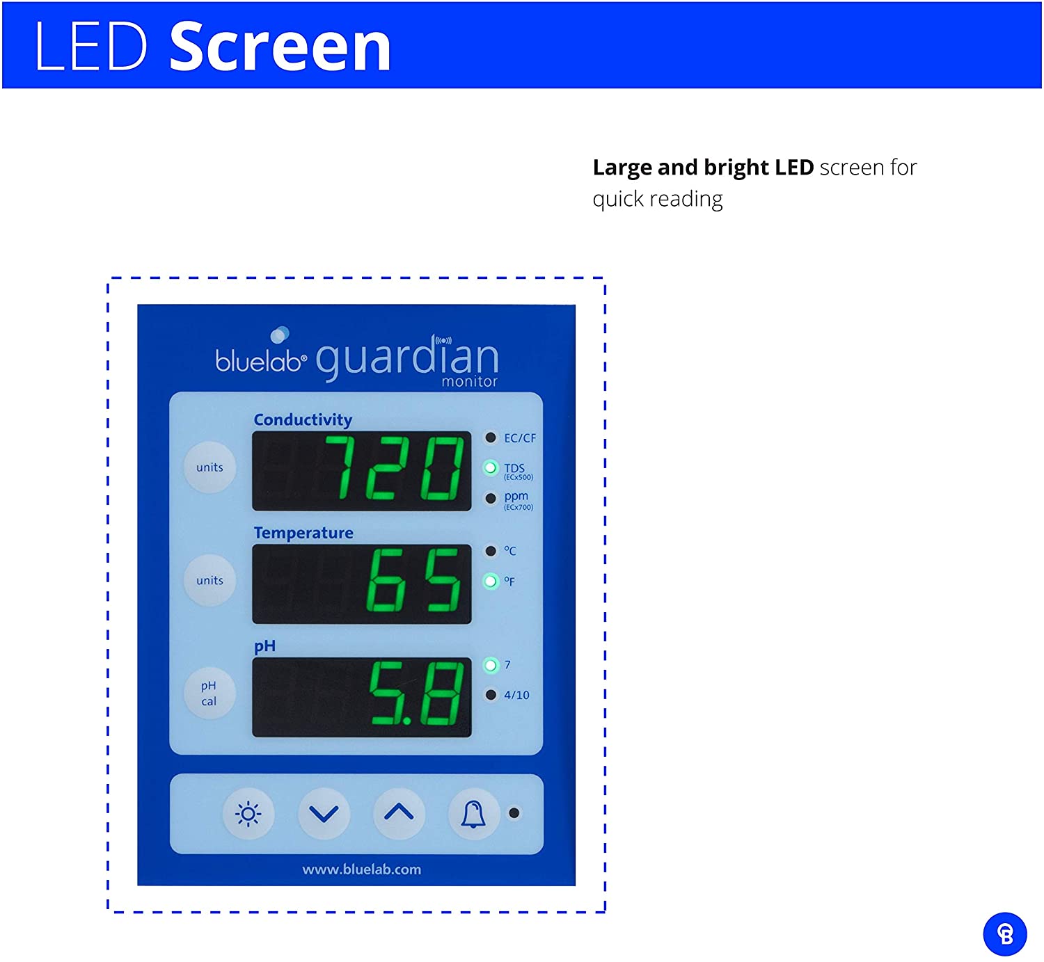 This hydroponic tester has ATC that provides a consistent reading regardless of temperature fluctuations; High and low alarm when parameters are out, selectable units include TDS, EC, ppm 500, ppm 700 and CF