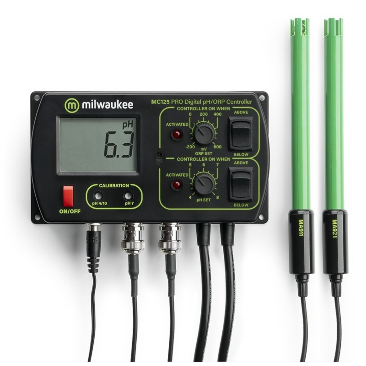 The MC125 PH & Redox Controller is a combo, PH & REDOX controller meter. It has two coupling sockets to connect external equipment (ozone generator, electro-valve or dosing pump) The MC125 PH and Redox Controller coupled with a solenoid valve for CO2 and an ozone generator is ideal for aquariums, fish farming. 1/ In its PH function, the MC125 PH and Redox Controller continuously measures the PH and we can attach a solenoid valve or any solenoid valve or dosing pump that will be activated when the controller meter has passed the chosen set point. In its PH function, the MC125 PH and Redox Controller has a scale of 0.0 up to 14.4 pH. Its calibration is manual. Its external equipment control block has a wheel to set the setpoint: from 4 to 8 pH. At the same time as the outdoor equipment is activated, a visual alarm (red LED) will also be activated. The calibration of the MC125 PH and Redox Controller in its PH function is manual (at 2 points: pH 7.01 and pH 4.01/10.1); Range: 0.0 to 14.0 pH; Resolution : 0.1pH; Accuracy: 0.2pH pH Electrode: MA911B/2, with 2 meter cable, BNC connector (included) 2/ In its Redox function, the MC125 PH and Redox Controller continuously measures the redox potential of your water. Redox is a method of controlling water quality; It tells us about the oxidation/reduction potential of water. a) Aquariums: In fresh water, from 250mV are considered good values. Seawater values range from 350 to 400mV. b) Swimming pools: The value necessary to eliminate certain bacteria is 600mV. c) Wastewater: Redox measurement is mainly used in the detoxification of wastewater, with the reduction of chromate or oxidation of cyanide. The MC125 PH and Redox Controller has another socket and coupling (in addition to the PH function coupling socket), to connect an ozone generator that will be activated when the controller meter has passed the setpoint we have chosen. In its ORP Redox function, the MC125 is factory calibrated. 3/ Installing the MC125 PH & Redox Controller : Connect the 12VDC adapter of the MC125 PH & Redox Controller meter to a multi-socket power strip Connect the 12VDC transformer to the power supply and the MC125 monitor Connect the coupling sockets to the power supply (2 x Black and white socket) Connect the ORP Redox MA921 probe to the monitor on its ORP connector Connect the MA911 PH probe to the monitor on its PH connector Remove the plugs electrode protectors. Immerse the pH and Redox electrodes in the water to be measured (2.5 cm) and let them float with the help of a wide polyexpan, for example. Turn on the meter by pressing the ON/OFF button Choose PH or Redox menu by moving the central black button (Top: ORP Redox; Down : PH) In both functions, choose the direction of the parameter (e.g. for PH rising, button in “above” position); The same in the Redox menu. Set the set point for each parameter, with the help of the graduated wheel for each parameter. Allow the reading to stabilize and the meter will begin continuous monitoring. A visual alarm indicates when the measurement exceeds the set point. When the alarm is activated, the docking station is also activated, and from there the auxiliary equipment is turned on. PH Calibration : Go to the PH menu (central black button down) Immerse the electrode in a sachet of pH7.01 calibration liquid and wait for the data to stabilize. With the help of the screwdriver, set the data to pH7.0 Immerse the electrode in a sachet of pH4.01 or pH10.01 calibration liquid and wait for the data to stabilize. With the help of the screwdriver, set the data to pH4.0 or pH10.01 The meter is calibrated and ready to measure in PH. It is advisable to calibrate the meter at least once a month, or after a long period of non-use or after electrode change. Good measurements with the MC125 PH Controller and Redox.