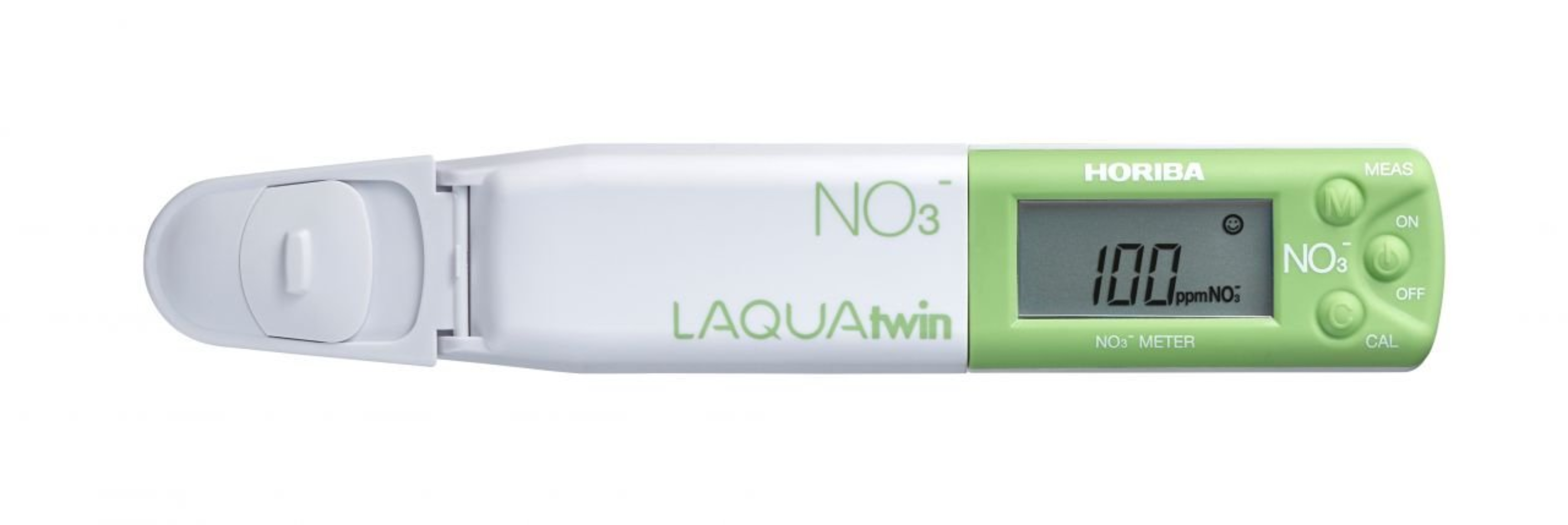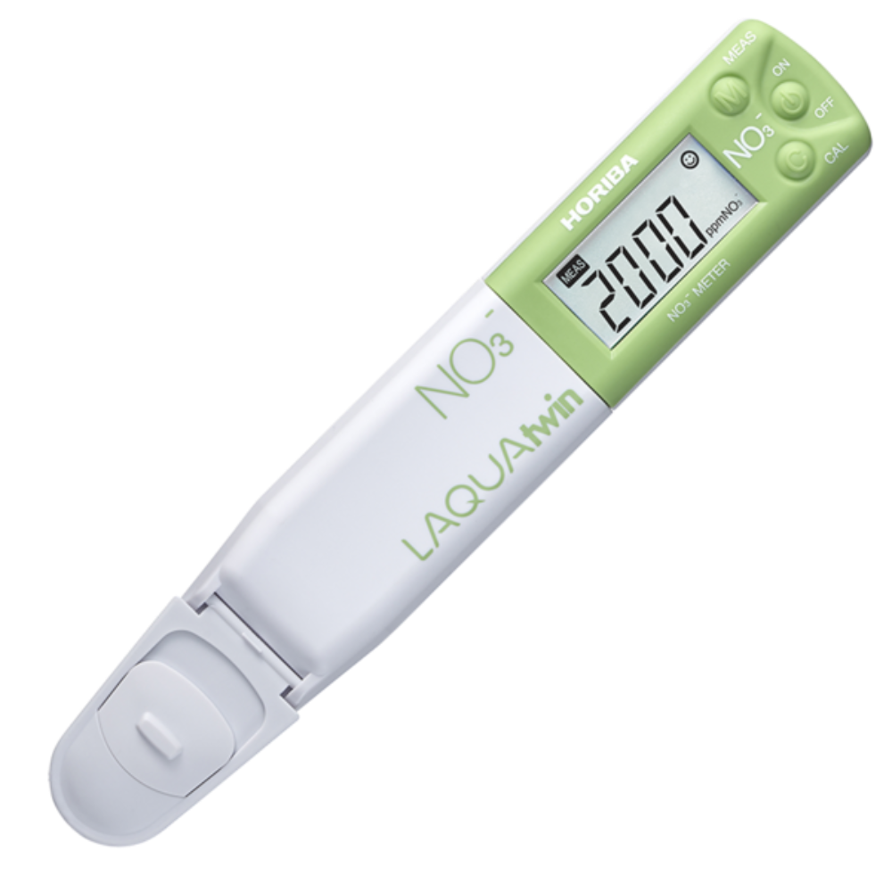 LAQUAtwin-NO3-11 is a waterproof nitrate meter with a large backlit LCD display. This equipment incorporates a flat ion electrode, unique in the world, designed with the latest HORIBA technology for micro-volume measurement. The replaceable electrode makes use of the same measurement principle as the traditional nitrate ion selective electrode (ISE); however, NO3-11 only requires a few drops (0.3 ml) to provide a fast and accurate analysis.