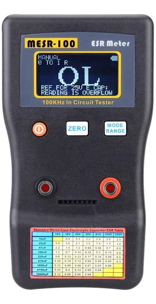 Dual terminal, for quick and easy inspection of the capacitor’s internal resistor, a printed ESR table for quick verification.